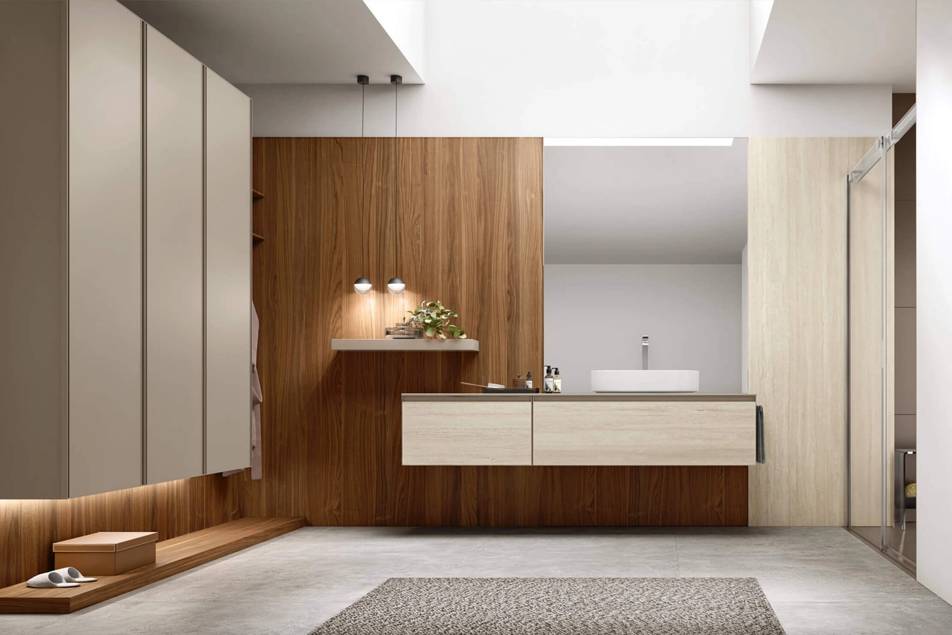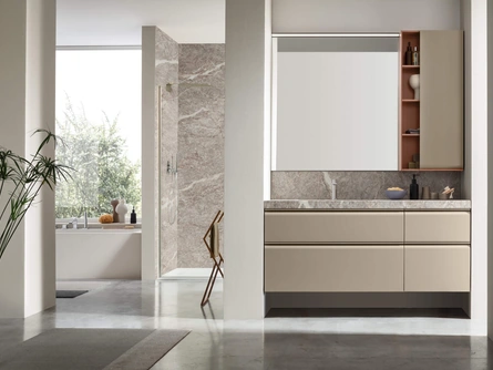 Arreda la stanza del benessere design alla perfezione con Shape 18, mobili bagno sospesi e complementi in gres di Arcom.