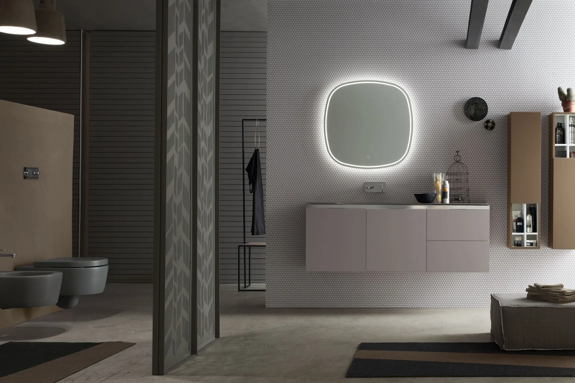 Mobili bagno sospesi in laccato opaco dell'azienda Arcom: clicca e scopri l'arredo bagno moderno E-Gò 69 per il bagno di casa.