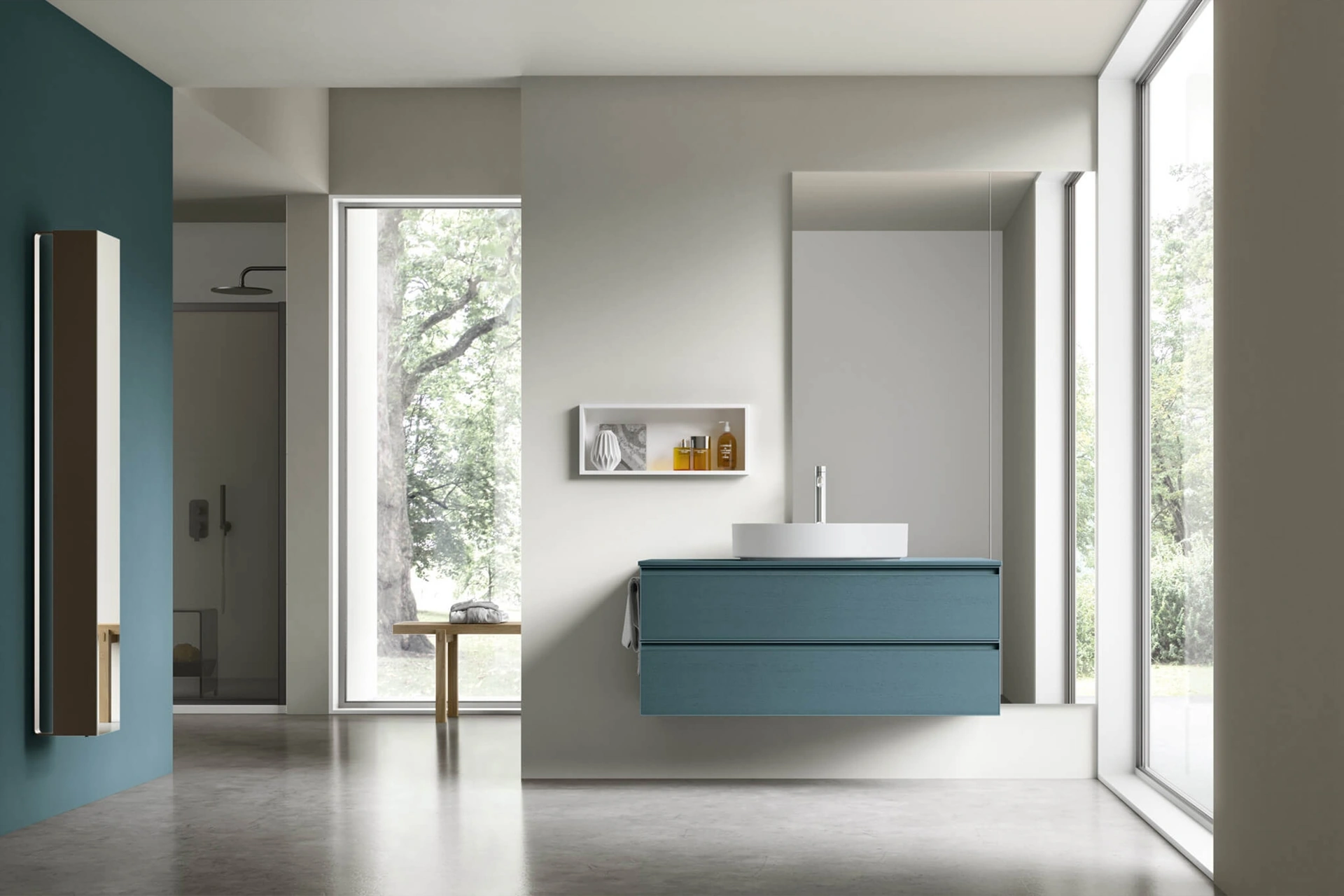 Arreda la stanza del benessere moderno al meglio con Shape 29, mobili bagno sospesi e accessori in legno di Arcom.