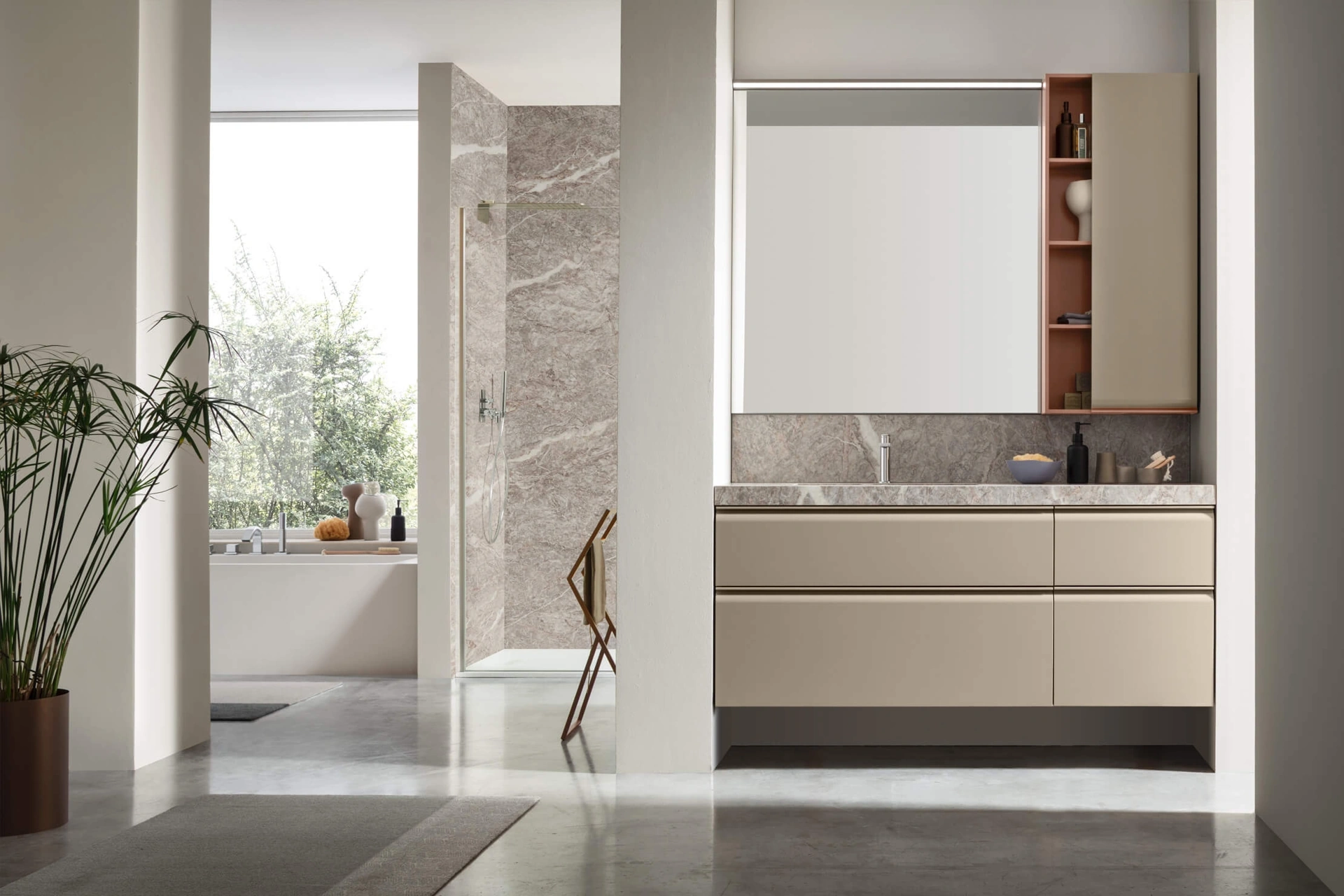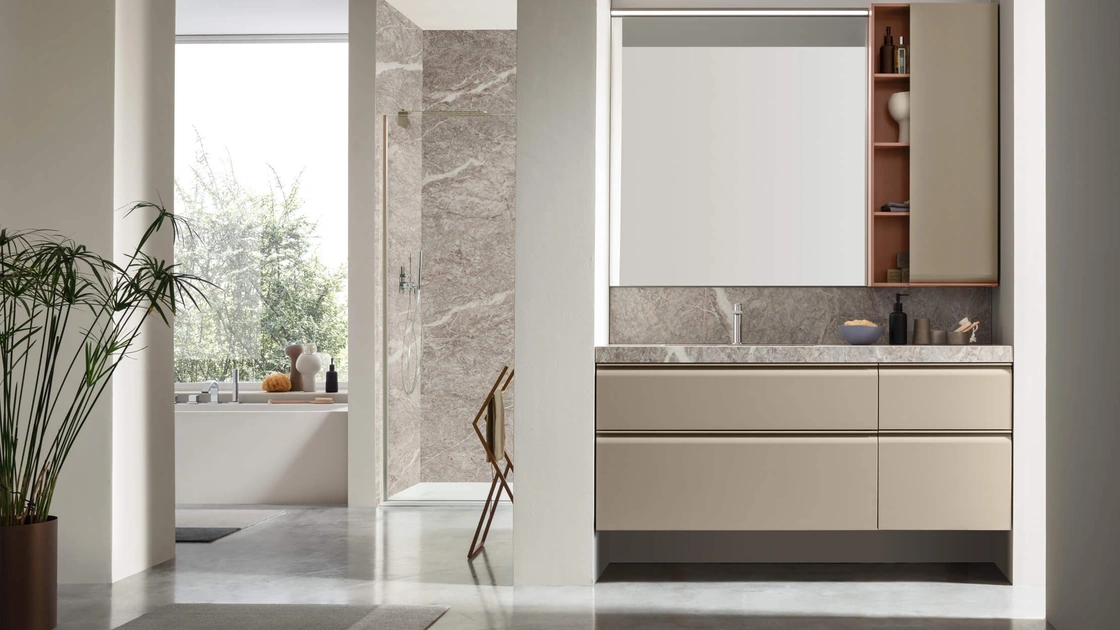Scopri di più sull'arredo bagno moderno: mobili bagno sospesi in laccato opaco come il modello Virgola 02 di Arcom ti attendono.
