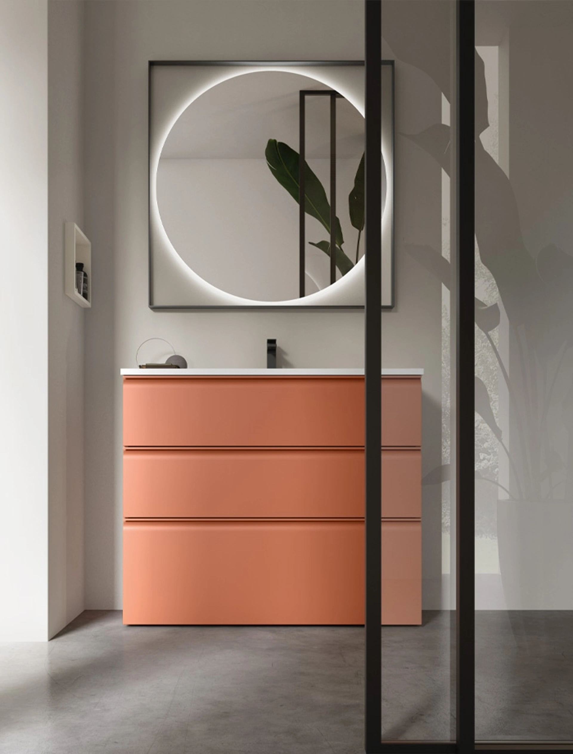 Arreda la stanza del benessere moderno ottimamente con Virgola 07, mobili bagno a terra e accessori in laccato opaco di Arcom.