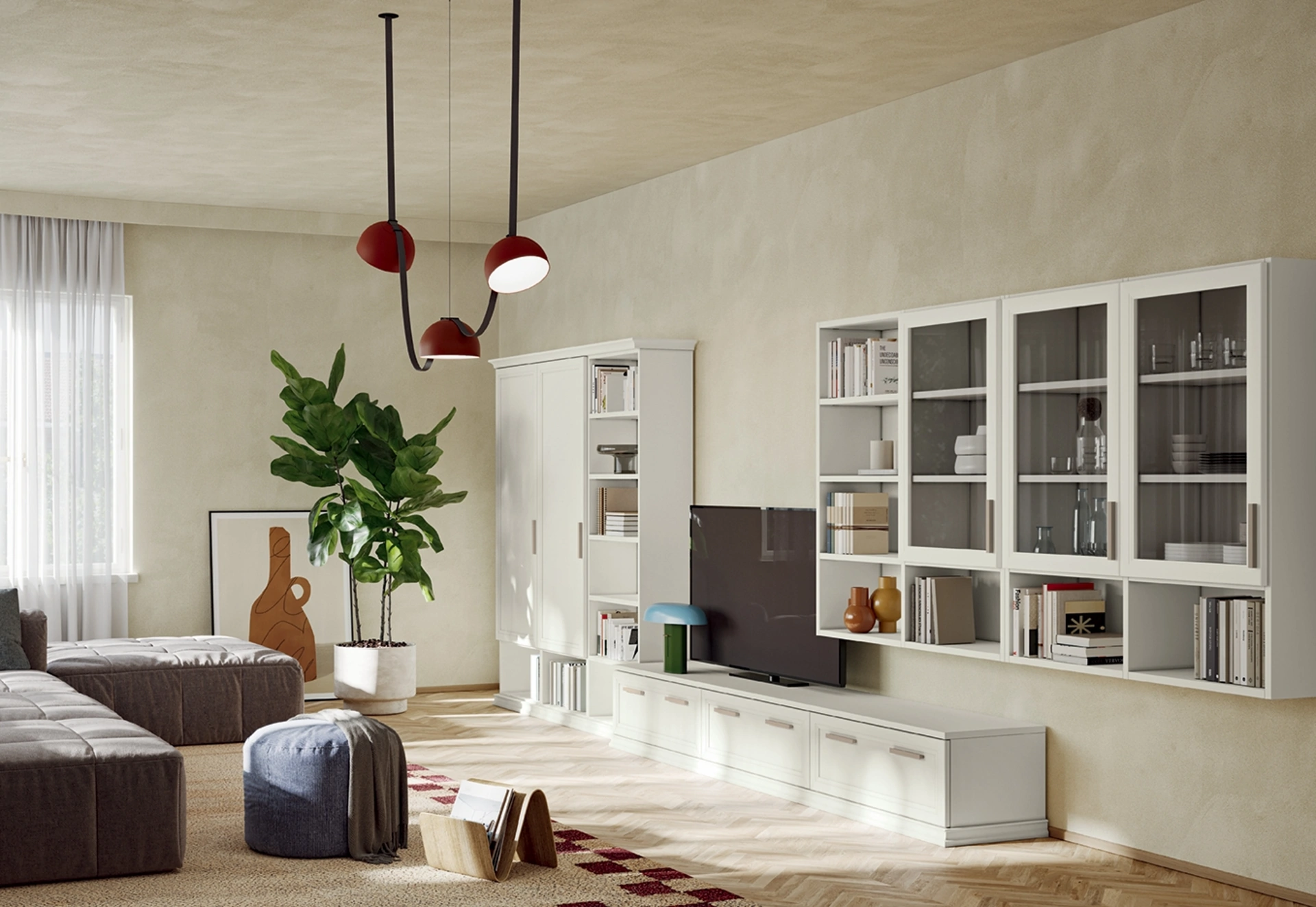 Attraverso un gioco dinamico di accostamenti fra elementi a giorno o vani chiusi, le Pareti Attrezzate classiche arredano il living ottimizzando ogni spazio. Questa parete attrezzata è una delle soluzioni del marchio e ti consentirà di arredare il soggiorno seguendo le più particolari esigenze abitative. Le Pareti Attrezzate hanno acquisito un posto importante nella zona giorno delle nostre case: sono arredi multifunzionali e salvaspazio sempre realizzabili su misura.