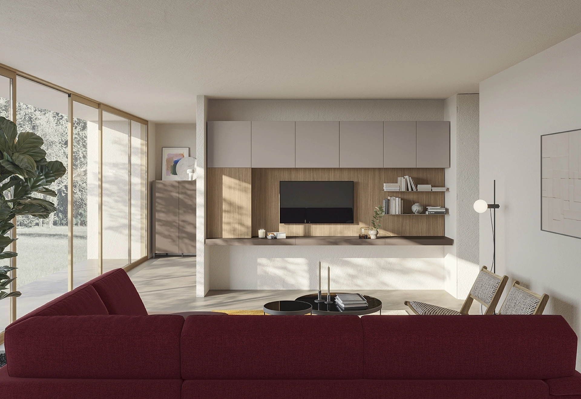 Vuoi allestire un soggiorno dinamico e operativo? Ecco a te la parete attrezzata Night & Day L01 Colombini Casa dalle forme decise moderne.